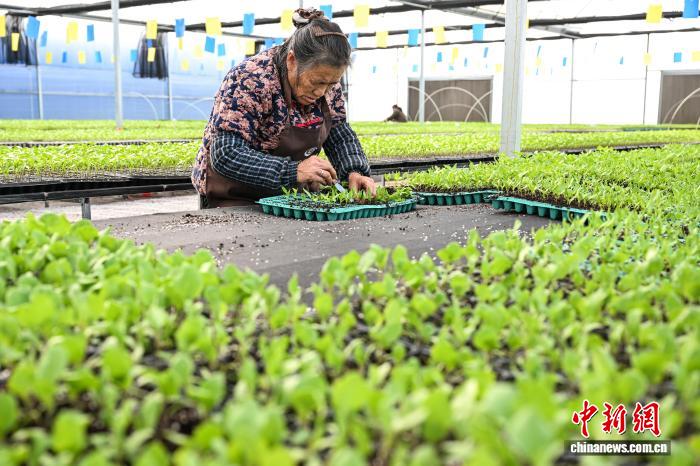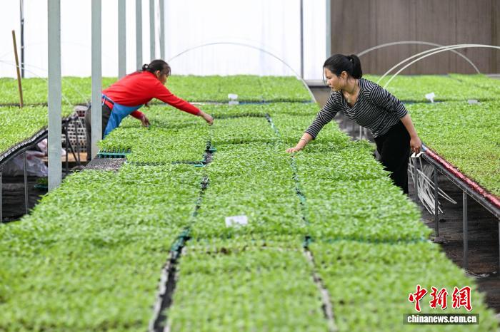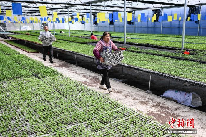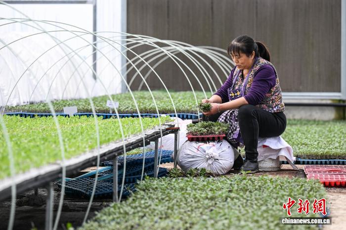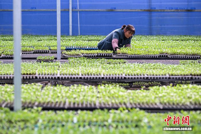 3月10日,工人正在贵州省黔北州独山县麻万镇花圃村育苗基天拾掇蔬菜苗。中新社记者 瞿宏伦 摄